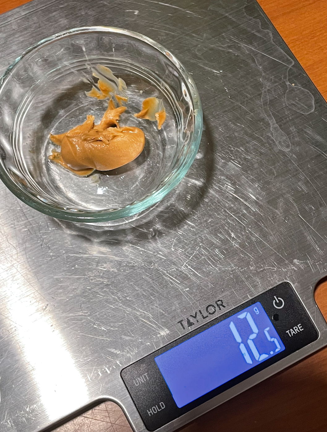 This food scale is home to the habit of portion control. It is out on the kitchen counter.